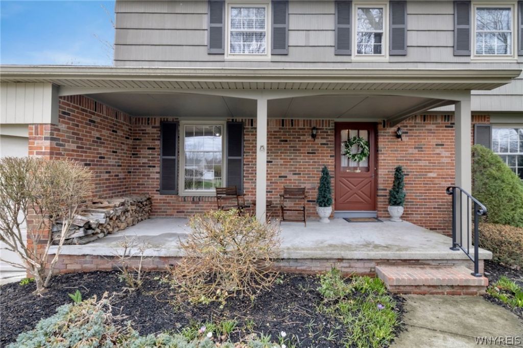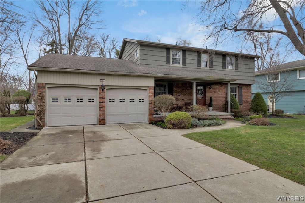 Located within the highly sought-after Williamsville SD, and built by well-known builder Dick Snyder, this 4-bedroom, 2.5-bath home offers over 2,100 SQ ft w/an attached 2-car garage. Curb appeal shines w/ brick front that carries across the lower level and covered front porch that together create a cozy and inviting fa?ade, w/brick steps leading to the entrance. A double-wide concrete driveway leads to the two-bay garage, while an extra-deep front porch offers a comfortable place to take in the quiet, tree-lined setting. The tiled foyer sets the tone for a traditional, well-planned layout w/crown molding details and plantation shutters throughout the 1st floor. The formal dining room offers hardwood flooring and a chair rail along w/shutter doors to the kitchen, while the living room features built-in shelving, blending character and flexibility. Serving as the heart of the home, the spacious family room is anchored by a brick fireplace bringing both warmth and classic charm. In the kitchen, granite countertops, tiled backsplash, updated cabinetry, recessed lighting, and a full stainless appliance package come together in a functional, well-appointed space. A bright breakfast area surrounded by windows fills the room w/natural light and overlooks the private backyard. A half bath and mudrm-style transition connect the home to the garage and extend into an enclosed 3-seasons room, offering additional living space and easy access to the rear yard. Upstairs, the primary bedrm features hardwood flrs, double closets and a private ensuite w/a tiled walk-in shower. Three additional bedrooms are well-proportioned w/hardwood flooring, crown molding and solid core doors. The full bath has been refreshed w/newer vanity, toilet and tile flooring. The basement provides solid mechanicals including a new 150-amp electrical panel, multi-zone boiler system, sump pump w/battery backup, and copper plumbing, all supported by poured concrete foundation. This well-kept home reflects consistent care and attention, offering space, comfort and opportunity for its next owner! Showings (by appointment only, NO OPEN HOUSE) begin Sat 4/18. Seller reserves the right to set an offer deadline