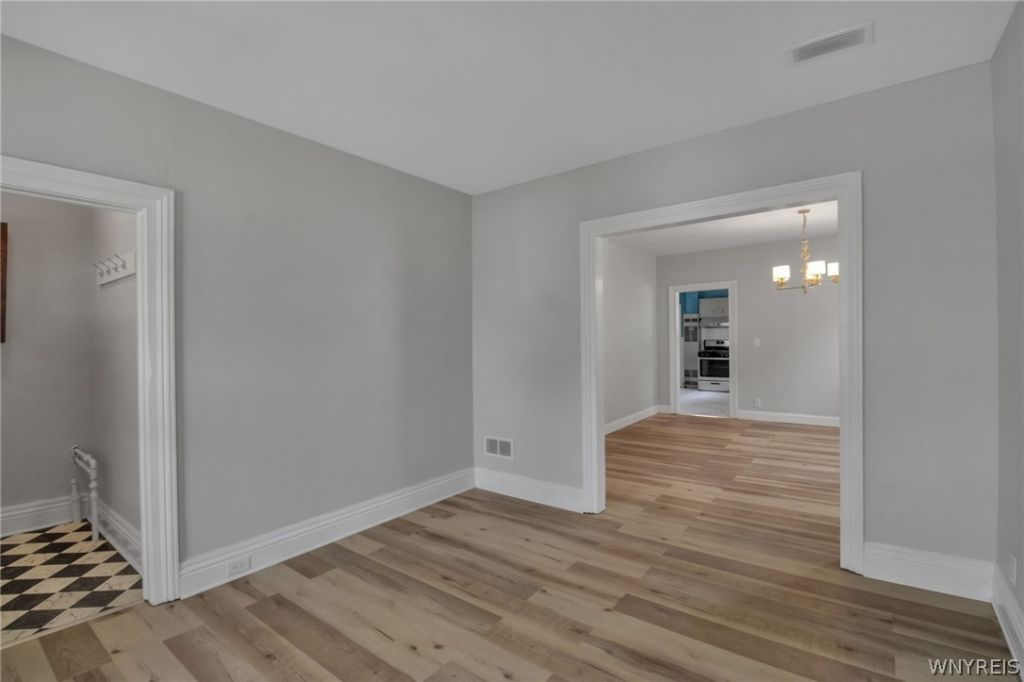Welcome to 23 Pooley Place, a perfectly renovated 3-bedroom, 1-bathroom home offering 1,044 square feet of smartly designed living space in the vibrant West Side of Buffalo, NY. Nestled on a quiet residential street, this home is the perfect mix of comfort, character, and beauty. You are initially greeted with a charming front porch, complete with maintenance free vinyl railings. Upon entering through the new front door, you walk into a sunlit living area boasting all new flooring and a welcoming layout. The updated kitchen features ample cabinet space, new flooring, new granite countertops, just waiting for your personal touches. Whether you're entertaining or enjoying a quiet night in, this space adapts to your lifestyle with ease. The home currently offers three comfortable bedrooms, with an additional flex space that could be used as a fourth bedroom, office, or bonus room; perfect for growing households or those working from home. One fully updated bathroom includes a new vanity, gorgeous ceramic tub surround, and new flooring. Upstairs you will find brand new carpets throughout, and three spacious bedrooms perfected with a fresh coat of paint. Outside, the yard offers space to relax, garden, or entertain. The new windows and doors, along with the newer roof (18') enhance not only the fuel efficiency of the house, but also give it amazing curb appeal. Located just minutes from local shops, restaurants, parks, and public transportation, 23 Pooley Place provides easy access to all that Buffalo's West Side has to offer. This is a fantastic opportunity for first-time buyers, investors, or anyone looking to be part of the West Side's exciting atmosphere.