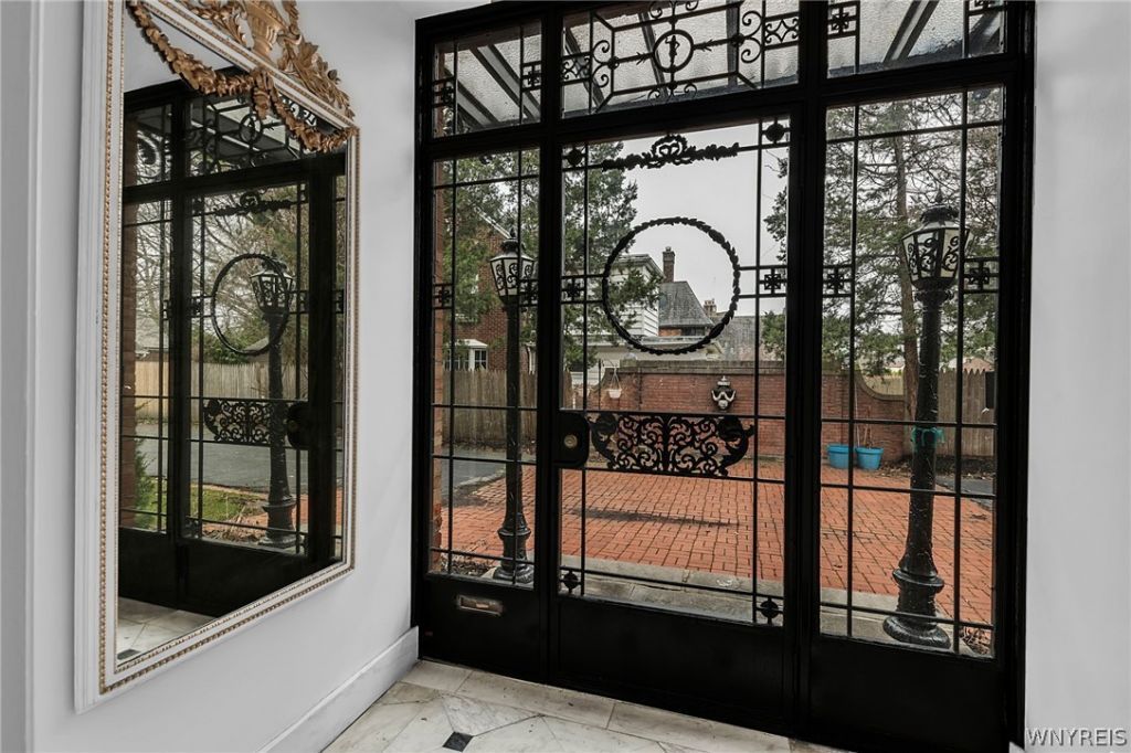 An extraordinary French-inspired estate presiding over prestigious Nottingham Terrace, directly overlooking the timeless beauty of Delaware Park. This distinguished residence blends classic European elegance with grand scale and exceptional craftsmanship. A stately wrought-iron entrance opens to a breathtaking two-story marble foyer, where a sweeping staircase creates a striking first impression. The formal living room is magnificent, featuring lustrous parquet flooring, three sets of French doors, an elegant fireplace, and intricate architectural detailing, all illuminated by abundant natural light. The formal dining room is designed for refined entertaining, showcasing exquisite wainscoting and curated vintage sconces. Eat-in kitchen is both beautiful and functional, highlighted by a striking Italian tile island, gas cooktop, stainless steel appliances, and generous storage. A richly appointed pine-paneled library offers old-world charm with a gas fireplace and custom built-ins. Additional first-floor amenities include a powder room, laundry suite, and attached three-car garage leading to a bright and private game room with dry bar, skylights, exposed brick, and sweeping garden views. The upper level hosts a serene primary suite featuring a private fireplace, picturesque park views, an ample dressing room, and a spa-inspired bath with jacuzzi tub and steam shower. Five additional bedrooms offer exceptional flexibility, complemented by well-appointed baths and a cedar closet. Thoughtfully updated with central air, newer roof, sump pump, whole-house generator, and underground sprinkler system. The private grounds offer manicured English gardens and new landscaping along brick wall feature. Perfectly positioned steps from Delaware Park-the crown jewel of Frederick Law Olmsted's visionary design-this exceptional residence offers an unparalleled lifestyle just moments from Buffalo's finest amenities.