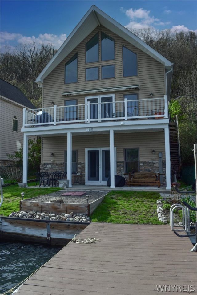 This three-story lake house features two bedrooms, two full bathrooms, and beautiful views of Keuka Lake. Just a short walk from the Village of Hammondsport with its, restaurants, shops, and waterfront, you can enjoy the perfect blend of Keuka Lake living and village convenience. Stairs and elevator access bring you to the home, where radiant heated floors run throughout every level for year-round comfort. The main floor offers a beautiful, thoughtfully designed kitchen. The second story includes the primary bedroom and bathroom, along with a quiet space ideal for a home office or library. With air-conditioning and a generator, the property is truly move-in ready. A deck off the dining area overlooks the water, creating an ideal spot for morning coffee and sunrise views. The walkout basement opens to a spacious patio, offering a seamless connection between indoor and outdoor living. Two docks and a dedicated boat slip provide effortless access to the lake, whether you're relaxing by the water or heading out for a day on the boat. Thoughtfully designed and ideally located, this home offers a warm and welcoming year-round Keuka Lake retreat.